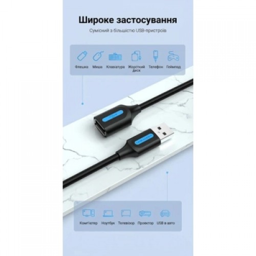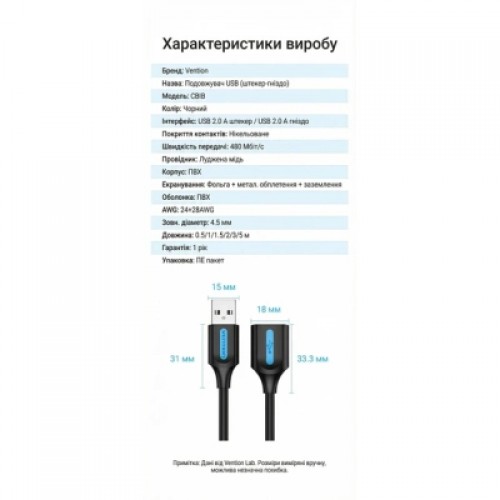 Кабель-подовжувач Vention USB 2.0 (0.5 м, тато на мама, 480 Мбіт/с, екранований, нікельовані контакти, чорний)