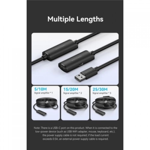 Ця модель довжиною 10 метрів оснащена одним активним блоком підсилення, який вбудований безпосередньо у корпус приймального роз'єму, тому на самому кабелі відсутні проміжні потовщення. Для коректної роботи пристроїв з високим енергоспоживанням, таких як зовнішні жорсткі диски великої ємності або потужне промислове обладнання, необхідно підключити зовнішній адаптер живлення до порту USB-C, що знаходиться на бічній грані корпусу роз'єму, оскільки сили струму від одного USB-порту комп'ютера на такій відстані може бути недостатньо для стабільного функціонування підключеного гаджета.