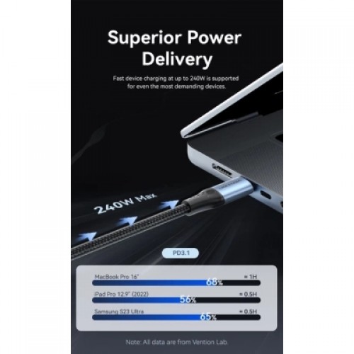 Підтримка Power Delivery 3.1 на 240 Вт: Цей кабель використовує вдосконалений протокол зарядки PD 3.1 для підтримки максимального струму 5 А та напруги 48 В, що забезпечує величезну вихідну потужність 240 Вт. Це робить його винятково здатним живити найвимогливіші ноутбуки на ринку, наприклад, заряджати MacBook Pro 16" до 68% приблизно за одну годину, залишаючись при цьому зворотно сумісним з пристроями меншої потужності, такими як планшети та смартфони, для швидкого поповнення заряду батареї.