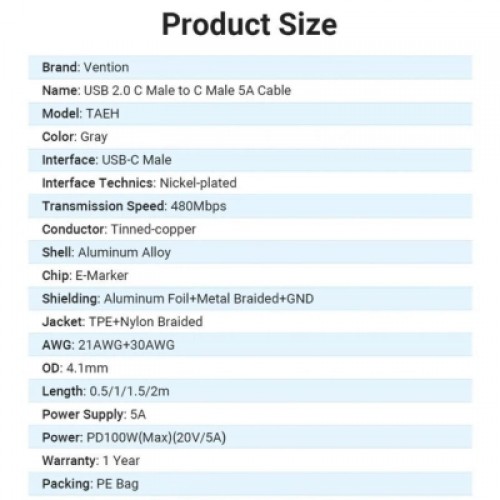 Модель | USB-C to USB-C 2.0m 5A aluminum gray |