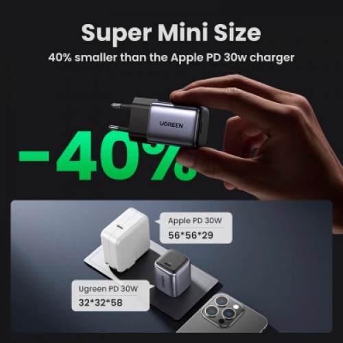 Ще швидше завантаженняВи дбаєте про час? З Ugreen вам не доведеться довго чекати, доки ваші пристрої знову будуть готові до використання! Зарядний пристрій Ugreen CD319 забезпечує потужність до 30 Вт, що означає, що він може зарядити iPhone 13 mini до 60%, iPad Pro до 35% та Huawei Mate 40 Pro до 32% приблизно за 30 хвилин. Пристрій підтримує стандарти швидкого заряджання, такі як PD 3.0/2.0, QC4.0/3.0, PPS, SCP 10 В/2 A, FCP та ін.