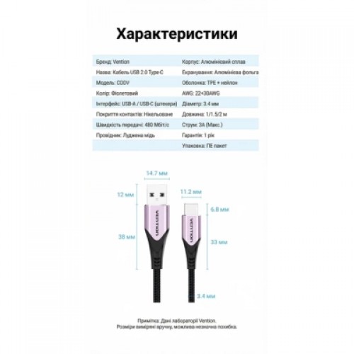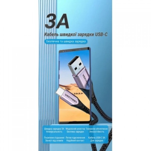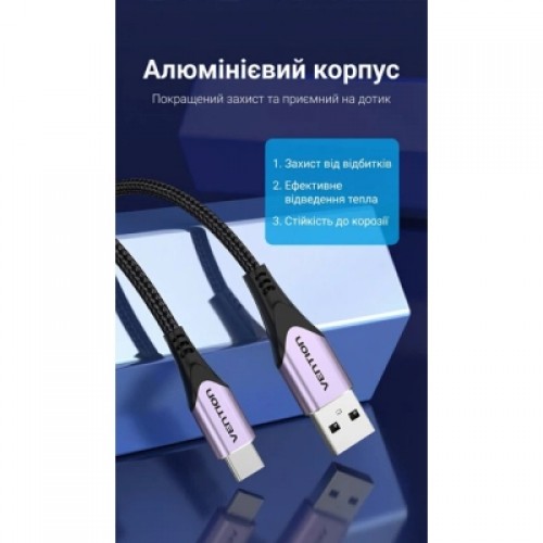 Кабель Vention USB-A на USB-C, 1.5 м, 3 А, швидка зарядка Quick Charge, передача даних 480 Мбіт/с, нейлонове обплетення, алюмінієві конектори, фіолетовий