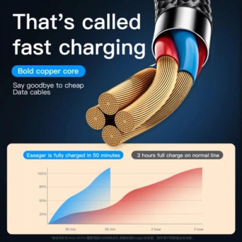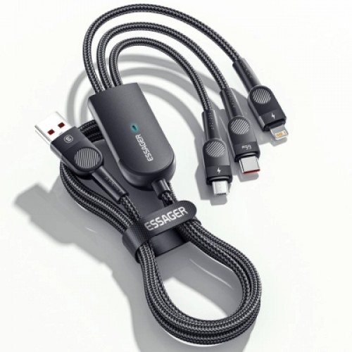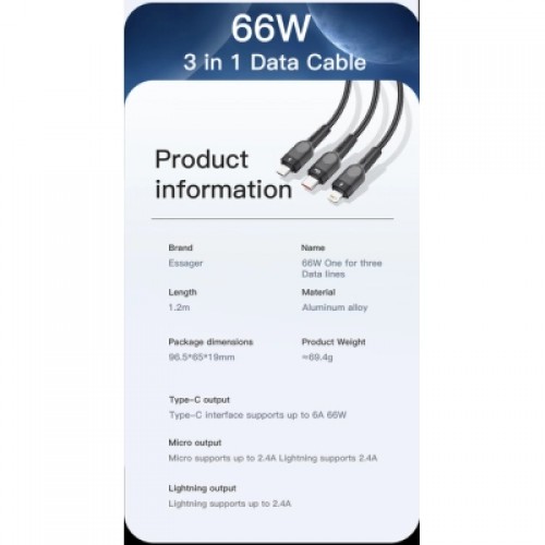 Essager 3-in-1 оснащен 3 разъемами — USB-C, Lightning и micro USB. Он поддерживает быструю зарядку мощностью до 66 Вт. С подходящим зарядным устройством разъем Type-C поддерживает быструю зарядку до 6А, сверхбыструю зарядку для Huawei 66W, совместим с основными протоколами быстрой зарядки (для Huawei, для Xiaomi, для OPPO, для Samsung и т. д.). Также он позволяет передавать файлы на скорости до 480 Мбит/с (на разъеме USB-C, Android и Apple не поддерживаются). В то же время он чрезвычайно прочен и обеспечивает безопасность использования.