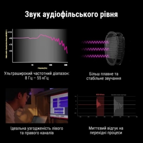- 100-мм планарные магнитные излучатели HIFIMAN с настройкой ROG: аудиофильское качество звучания в сверхшироком частотном диапазоне 8 Гц–55 кГц с яркой детализацией и исключительно низким уровнем искажений.